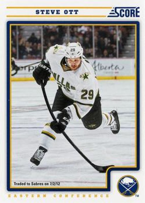The Steve Ott 2012 Score #75 Base card is 1 of 5 Steve Ott's card variations in the 2012 Score set being tracked by Sports Card Investor, including Black Ice, Gold Rush, Check It, and Signatures.