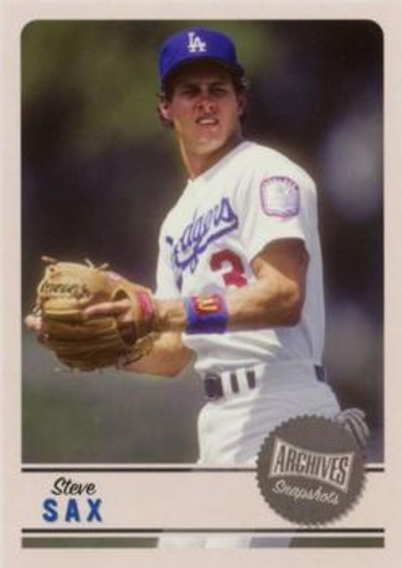 The Steve Sax 2019 Topps Archives Snapshots #AS-SS Base card is 1 of 9 Steve Sax's card variations in the 2019 Topps Archives Snapshots set being tracked by Sports Card Investor, including Black & White, Blue /50, Gold /10, Black /1, and Autographs.