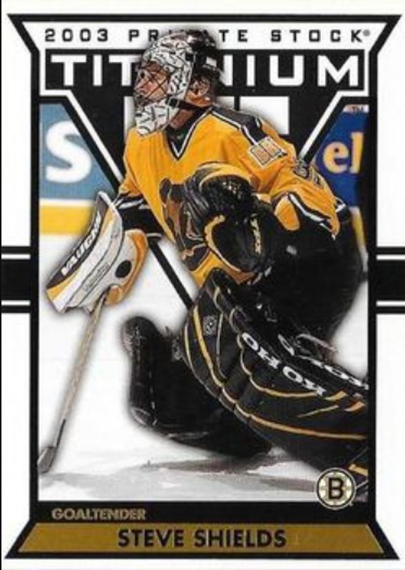 The Steve Shields 2002 Pacific Private Stock Titanium #9 Base /99 card is 1 of 4 Steve Shields' card variations in the 2002 Pacific Private Stock Titanium set being tracked by Sports Card Investor, including Retail /1475, Blue /450, and Red /299.