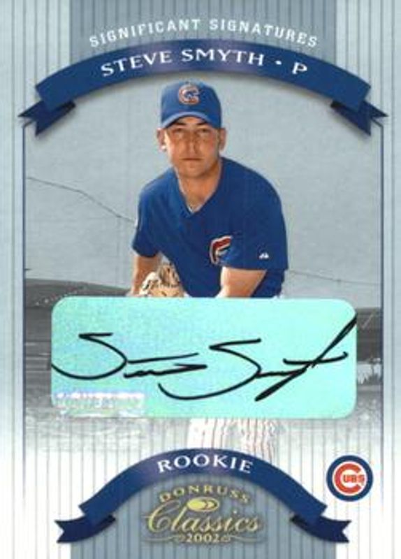 The Steve Smyth 2002 Donruss Classics #136 Significant Signatures /100 card is 1 of 4 Steve Smyth's card variations in the 2002 Donruss Classics set being tracked by Sports Card Investor, including Base /1500, Timeless Tributes /100, and Chicago National /5.