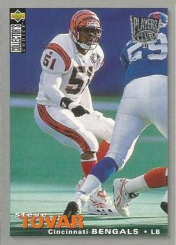 The Steve Tovar 1995 Upper Deck Collector's Choice #308 Player's Club card is 1 of 3 Steve Tovar's card variations in the 1995 Upper Deck Collector's Choice set being tracked by Sports Card Investor, including Base, and Platinum Player's Club.