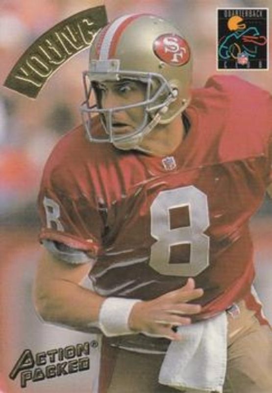 The Steve Young 1994 Action Packed #184 Base card is 1 of 11 Steve Young's card variations in the 1994 Action Packed set being tracked by Sports Card Investor, including #108 Base, #G18 24K Gold, #G54 24K Gold, #108 Braille, and #FF2 Fantasy Forecast.