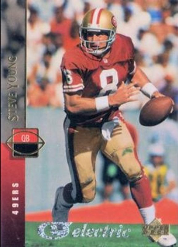 The Steve Young 1994 Upper Deck #145 Electric card is 1 of 7 Steve Young's card variations in the 1994 Upper Deck set being tracked by Sports Card Investor, including Base, Electric Gold, Predictors Exchange: League Leaders, Predictors: League Leaders, and Pro Bowl.