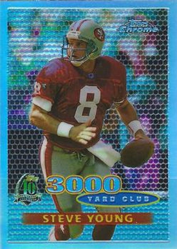 The Steve Young 1996 Topps Chrome #138 Refractor card is 1 of 7 Steve Young's card variations in the 1996 Topps Chrome set being tracked by Sports Card Investor, including #130 Base, #138 Base, #138 3,000 Yard Club - Refractor, #130 Refractor, and #18 40th Anniversary Retros.
