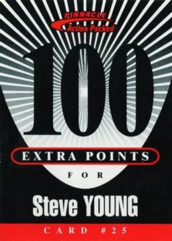 The Steve Young 1997 Action Packed Flagship #25 Extra Points 100 card is 1 of 8 Steve Young's card variations in the 1997 Action Packed Flagship set being tracked by Sports Card Investor, including Base, First Impressions, Gold Impressions, 24K Gold, and Extra Points 10.