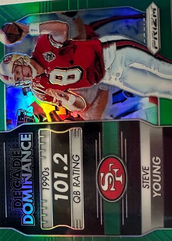 The Steve Young 2016 Prizm #3 Decade of Dominance - Green card in Raw condition has not changed in price in the last 30 days and was last sold for $5.60 .