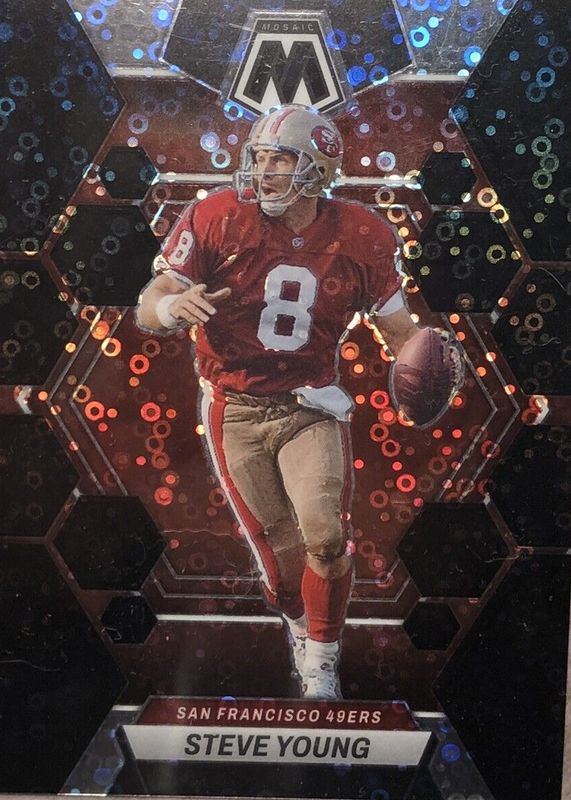 This card is 1 of 8 Steve Young's card variations in the 2023 Mosaic set being tracked by Sports Card Investor, including Choice Peacock /(SSP), Genesis /(SSP), Honeycomb /(SSP), White Sparkle /(SSP), and No Huddle Gold /10.