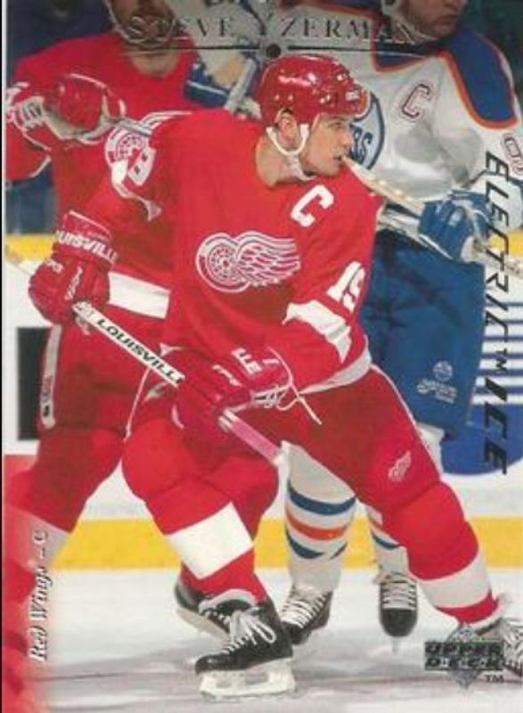 The Steve Yzerman 1995 Upper Deck #113 Electric Ice card is 1 of 14 Steve Yzerman's card variations in the 1995 Upper Deck set being tracked by Sports Card Investor, including #113 Base, #218 Base, #218 Electric Ice, #218 Electric Ice Gold, and #113 Electric Ice Gold.