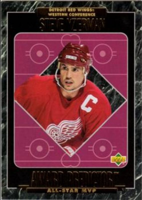 The Steve Yzerman 1995 Upper Deck #MVP-R15 Predictors All Star MVP Exchange card is 1 of 14 Steve Yzerman's card variations in the 1995 Upper Deck set being tracked by Sports Card Investor, including #113 Base, #218 Base, #218 Electric Ice, #113 Electric Ice, and #218 Electric Ice Gold.