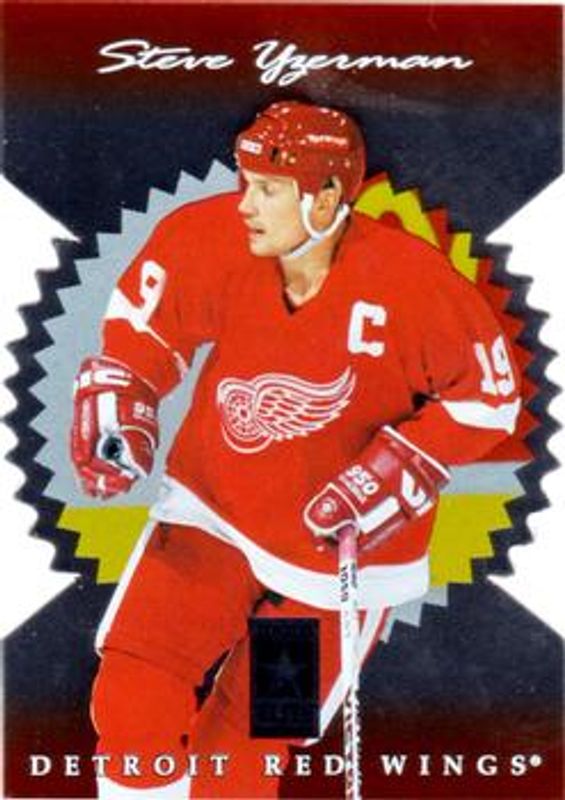 The Steve Yzerman 1996 Donruss Elite #38 Die-Cut card is 1 of 3 Steve Yzerman's card variations in the 1996 Donruss Elite set being tracked by Sports Card Investor, including Base, and Perspective /500.