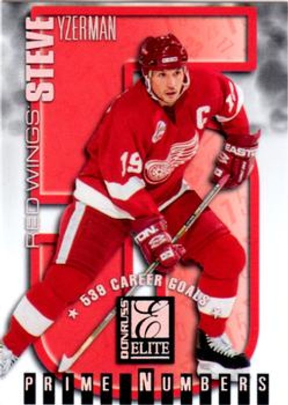The Steve Yzerman 1997 Donruss Elite #10a Prime Numbers /254 card is 1 of 23 Steve Yzerman's card variations in the 1997 Donruss Elite set being tracked by Sports Card Investor, including #122 Base, #15 Base, #15 Aspirations, #122 Aspirations, and #10a Prime Numbers Promos.