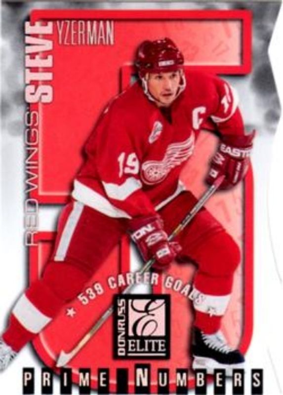 The Steve Yzerman 1997 Donruss Elite #10a Prime Numbers Die-Cut /254 card is 1 of 23 Steve Yzerman's card variations in the 1997 Donruss Elite set being tracked by Sports Card Investor, including #122 Base, #15 Base, #15 Aspirations, #122 Aspirations, and #10a Prime Numbers Promos.