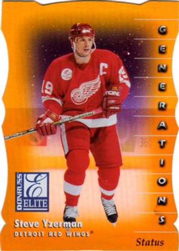 The Steve Yzerman 1997 Donruss Elite #122 Status /100 card is 1 of 23 Steve Yzerman's card variations in the 1997 Donruss Elite set being tracked by Sports Card Investor, including #122 Base, #15 Base, #15 Aspirations, #122 Aspirations, and #10a Prime Numbers Promos.
