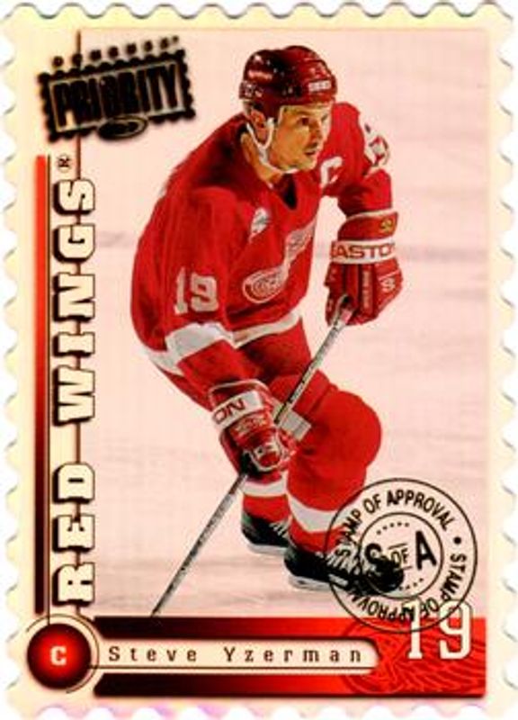 The Steve Yzerman 1997 Donruss Priority #4 Stamp of Approval /100 card is 1 of 12 Steve Yzerman's card variations in the 1997 Donruss Priority set being tracked by Sports Card Investor, including #4 Base, #209 Base, #2 Direct Deposit Promos, #209 Stamp of Approval /100, and #3 Postcards.