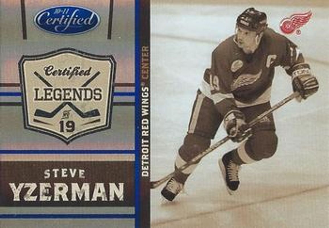 The Steve Yzerman 2010 Certified #5 Legends - Mirror Blue /100 card is 1 of 19 Steve Yzerman's card variations in the 2010 Certified set being tracked by Sports Card Investor, including Base /799, Mirror Red /100, Mirror Blue /50, Mirror Gold /25, and Mirror Gold Signatures /25.
