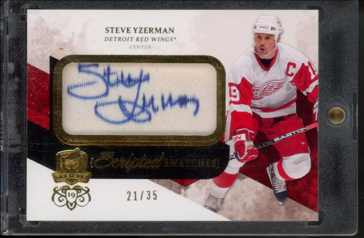 The Steve Yzerman 2010 Upper Deck The Cup #SS-SY Scripted Swatches /35 card is 1 of 21 Steve Yzerman's card variations in the 2010 Upper Deck The Cup set being tracked by Sports Card Investor, including Base /199, Gold /25, Gold Rainbow /25, Black /1, and Printing Plates Black /1.