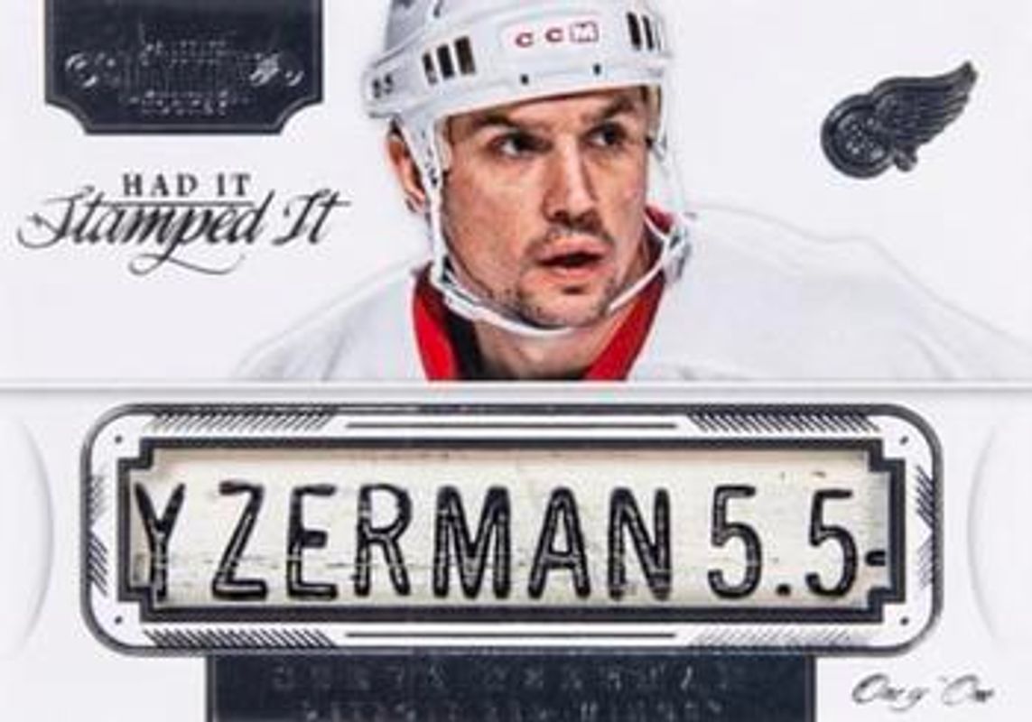 The Steve Yzerman 2013 Dominion #HI-SY Had It Stamped It /1 card is 1 of 5 Steve Yzerman's card variations in the 2013 Dominion set being tracked by Sports Card Investor, including Frozen Moments Autographs /50, Peerless Patches Autographs /50, Complete Sweaters /25, and Stickside Signatures /25.