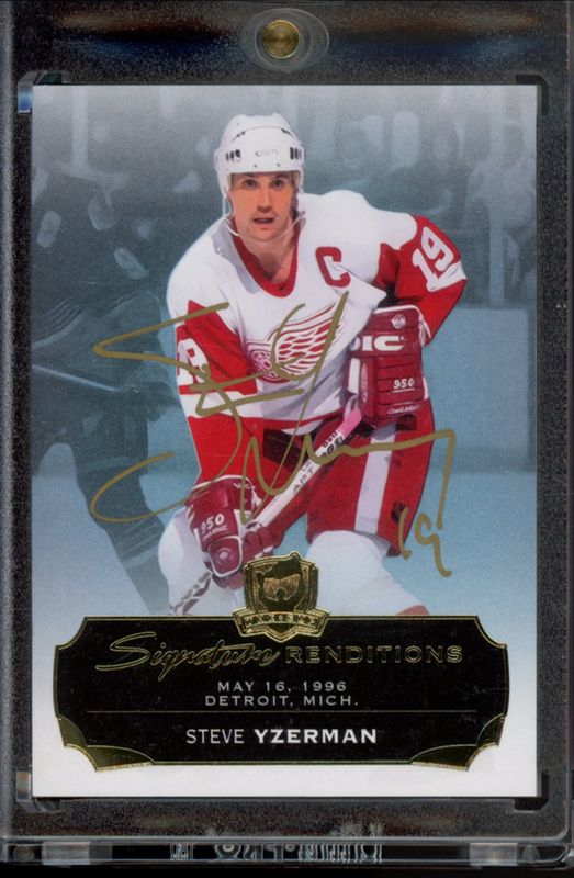 The Steve Yzerman 2014 Upper Deck The Cup #SR-YZ Signatures Renditions card is 1 of 21 Steve Yzerman's card variations in the 2014 Upper Deck The Cup set being tracked by Sports Card Investor, including Base /249, Artist Proof Limited Logos, Gold Spectrum Autographs /25, Gold /10, and Gold Foil /10.