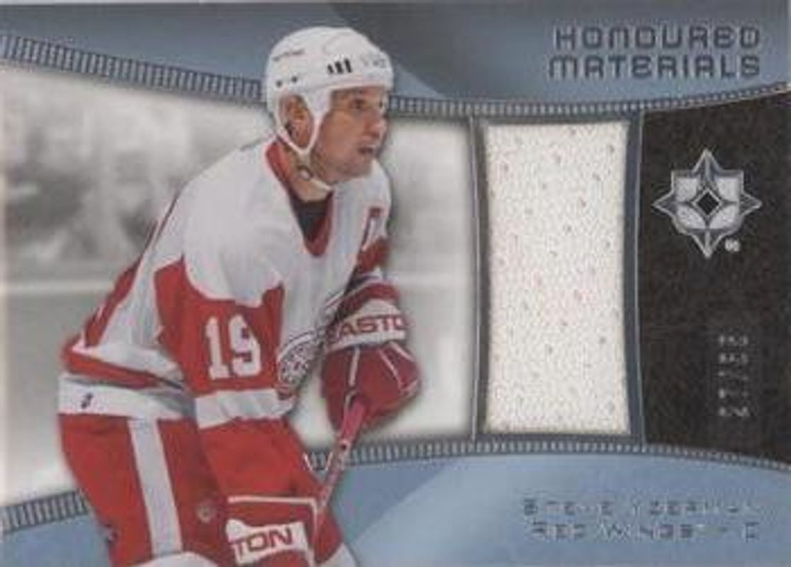 The Steve Yzerman 2015 Upper Deck Ultimate Collection #HM-SY Honoured Materials /99 card is 1 of 12 Steve Yzerman's card variations in the 2015 Upper Deck Ultimate Collection set being tracked by Sports Card Investor, including Material Achievements /99, Autographed Jumbo Materials /40, Honoured Materials Gold Patch /10, Signatures Iconic Fabrics Gold Patch /10, and Signatures Iconic Fabrics /8.