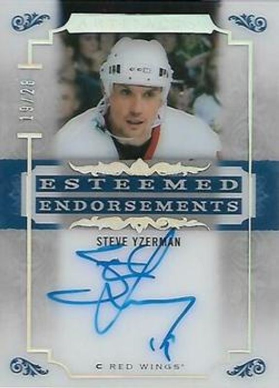 The Steve Yzerman 2020 Upper Deck Artifacts #EE-SY 2019 Upper Deck Artifacts Update /24 card is 1 of 5 Steve Yzerman's card variations in the 2020 Upper Deck Artifacts set being tracked by Sports Card Investor, including Aurum, 2019 Upper Deck Artifacts Update: Esteemed Endorsements /28, Aurum Bounty /25, and Aurum - Green /25.