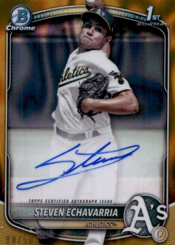 The Steven Echavarria 2025 Bowman #CPA-SE Chrome Prospect Auto - Gold Lava Refractor /50 (1st) card in Raw condition has not changed in price in the last 30 days and was last sold for $25.78 .