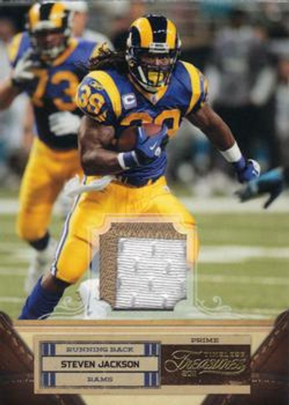 The Steven Jackson 2011 Timeless Treasures #94 Jerseys - Prime /25 card is 1 of 26 Steven Jackson's card variations in the 2011 Timeless Treasures set being tracked by Sports Card Investor, including Base /299, Silver /25, Gold /10, Platinum /1, and Gameday Souvenirs 1st Quarter /190.