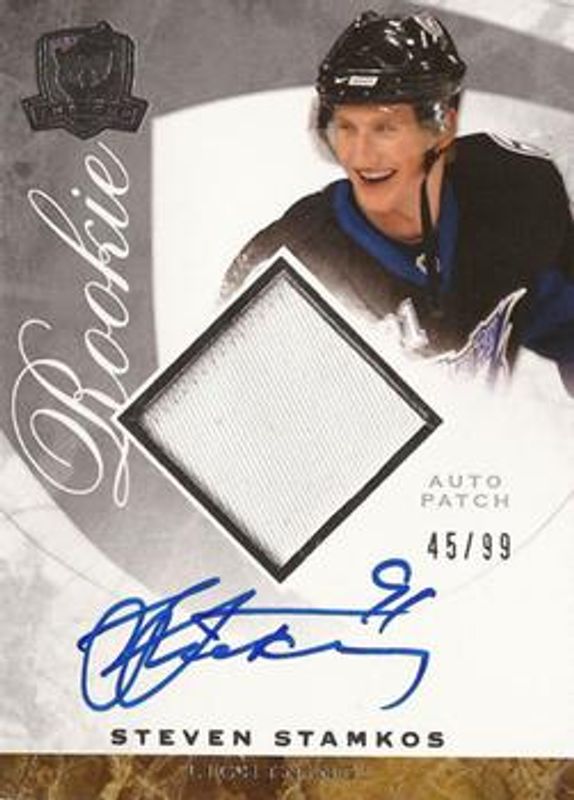 The Steven Stamkos 2008 Upper Deck The Cup #150 Base /249 Rookie card is 1 of 77 Steven Stamkos' card variations in the 2008 Upper Deck The Cup set being tracked by Sports Card Investor, including Artist Proof Foundations Patches, Gold Rainbow /67, Gold /25, Black /1, and Auto Draft Boards.