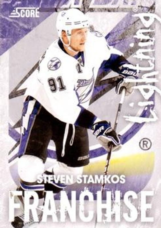 The Steven Stamkos 2010 Score #27 Franchise card is 1 of 12 Steven Stamkos' card variations in the 2010 Score set being tracked by Sports Card Investor, including #26 Base, #427 Base, #26 20th Anniversary, #427 20th Anniversary, and #427 French Back.
