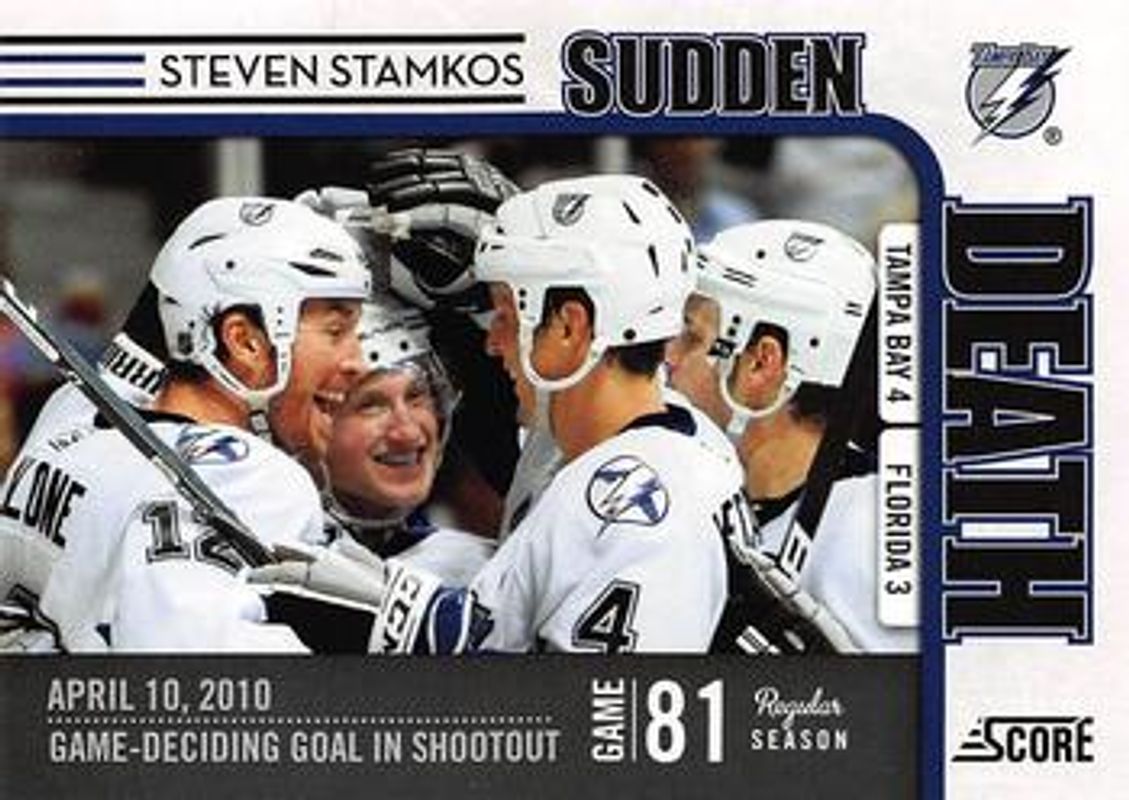 The Steven Stamkos 2010 Score #9 Sudden Death card is 1 of 12 Steven Stamkos' card variations in the 2010 Score set being tracked by Sports Card Investor, including #26 Base, #427 Base, #26 20th Anniversary, #427 20th Anniversary, and #427 French Back.