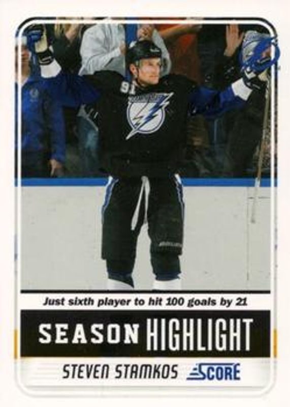 The Steven Stamkos 2011 Score #8 Glossy card is 1 of 14 Steven Stamkos' card variations in the 2011 Score set being tracked by Sports Card Investor, including #413 Base, #8 Base, #8 Black Ice, #413 Black Ice, and #413 Glossy.