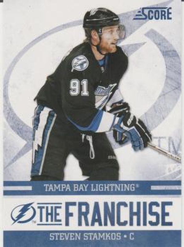 The Steven Stamkos 2011 Score #27 The Franchise card is 1 of 14 Steven Stamkos' card variations in the 2011 Score set being tracked by Sports Card Investor, including #413 Base, #8 Base, #8 Black Ice, #413 Black Ice, and #8 Glossy.