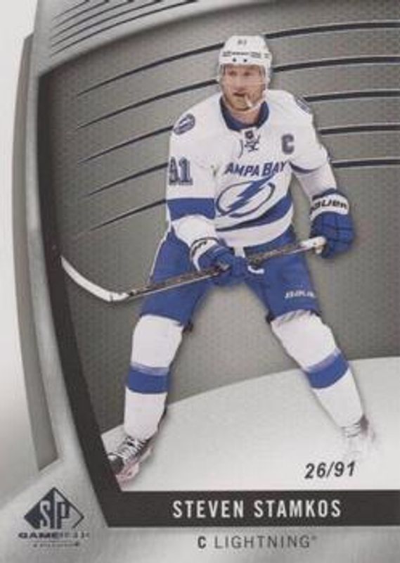 The Steven Stamkos 2017 SP Game Used #45 Base /73 card is 1 of 11 Steven Stamkos' card variations in the 2017 SP Game Used set being tracked by Sports Card Investor, including Blue Autographs, Red Autographed Jerseys, Gold Jerseys /399, Orange Rainbow /113, and Autographs /92.