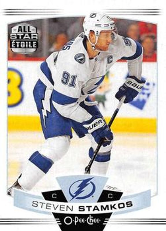 The Steven Stamkos 2019 O-Pee-Chee #219 Base card is 1 of 17 Steven Stamkos' card variations in the 2019 O-Pee-Chee set being tracked by Sports Card Investor, including Base, Blue Border, Gold Border, Red Border, and Red Border Blank Back.