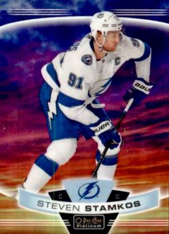 The Steven Stamkos 2019 O-Pee-Chee Platinum #39 Sunset card is 1 of 26 Steven Stamkos' card variations in the 2019 O-Pee-Chee Platinum set being tracked by Sports Card Investor, including #39b Base, #39 Base, #39 Matte Pink, #39 Pond Hockey, and #39 Rainbow.
