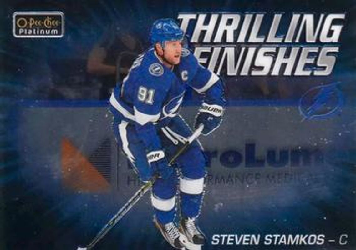 The Steven Stamkos 2019 O-Pee-Chee Platinum #TF-1 Thrilling Finishes card is 1 of 26 Steven Stamkos' card variations in the 2019 O-Pee-Chee Platinum set being tracked by Sports Card Investor, including #39b Base, #39 Base, #39 Matte Pink, #39 Pond Hockey, and #39 Rainbow.