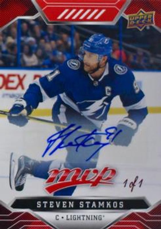 The Steven Stamkos 2019 Upper Deck MVP #203 Autographs Leaderboard Achievements Red /1 card is 1 of 21 Steven Stamkos' card variations in the 2019 Upper Deck MVP set being tracked by Sports Card Investor, including Base, Blue, Gold Script, Silver Script, and Super Script /25.