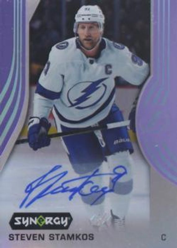 The Steven Stamkos 2019 Upper Deck Synergy #10 Purple /7 card is 1 of 15 Steven Stamkos' card variations in the 2019 Upper Deck Synergy set being tracked by Sports Card Investor, including Base /19, Red, Red Bounty, Blue /799, and Green /299.