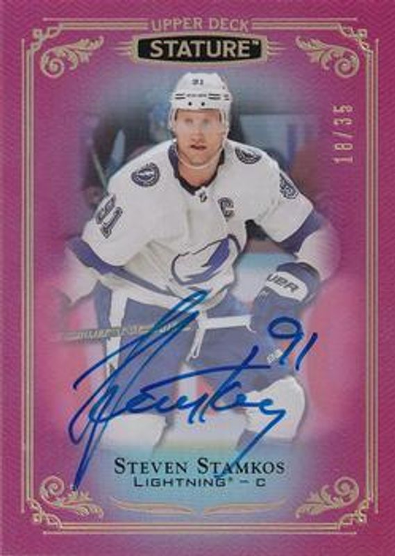 The Steven Stamkos 2020 Upper Deck Stature #21 2019 Upper Deck Stature Update: Autographs - Red /35 card is 1 of 16 Steven Stamkos' card variations in the 2020 Upper Deck Stature set being tracked by Sports Card Investor, including Base /399, Green /175, Portrait /99, Red /85, and Blue /45.