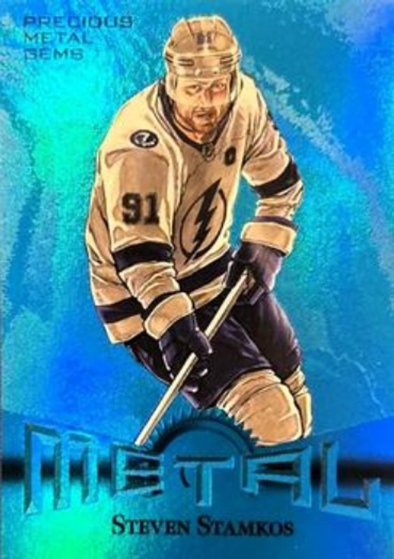 The Steven Stamkos 2022 Metal Universe #RT-13 2013 Retro Precious Metal Gems Blue /50 card is 1 of 25 Steven Stamkos' card variations in the 2022 Metal Universe set being tracked by Sports Card Investor, including Base, Spectrum FX Blue, Spectrum FX Purple /199, Precious Metal Gems Green /100, and Precious Metal Gems Red /100.