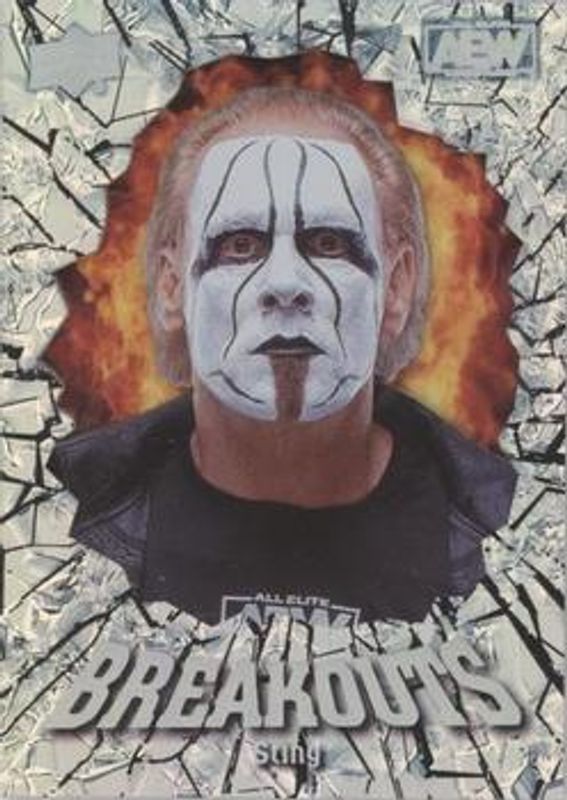 The Sting 2022 Upper Deck AEW #BO-12 Breakouts card is 1 of 34 Sting's card variations in the 2022 Upper Deck AEW set being tracked by Sports Card Investor, including Base, Gold, Pyro, Silver Foil, and Green Pyro /399.
