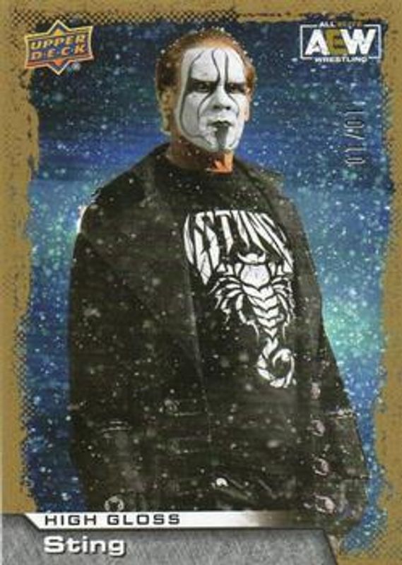 The Sting 2022 Upper Deck AEW #76 High Gloss /10 card is 1 of 34 Sting's card variations in the 2022 Upper Deck AEW set being tracked by Sports Card Investor, including Base, Gold, Pyro, Silver Foil, and Green Pyro /399.
