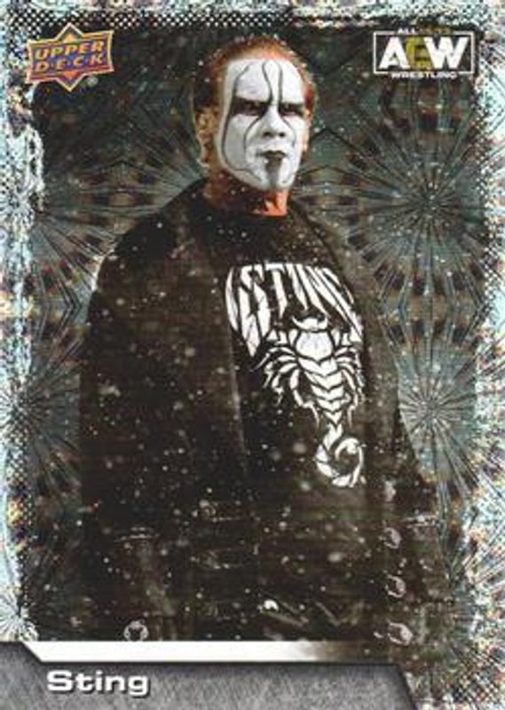 The Sting 2022 Upper Deck AEW #76 Pyro card is 1 of 34 Sting's card variations in the 2022 Upper Deck AEW set being tracked by Sports Card Investor, including Base, Gold, Silver Foil, Green Pyro /399, and Dynamite /299.