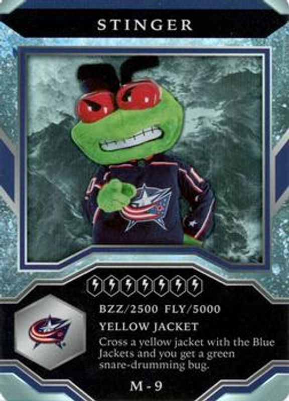 The Stinger 2021 Upper Deck MVP #M-9 Mascots Gaming card is 1 of 6 Stinger's card variations in the 2021 Upper Deck MVP set being tracked by Sports Card Investor, including Mascots Gaming Sparkle, Mascot Gaming - Printing Plates Black /1, Mascot Gaming - Printing Plates Cyan /1, Mascot Gaming - Printing Plates Magenta /1, and Mascot Gaming - Printing Plates Yellow /1.