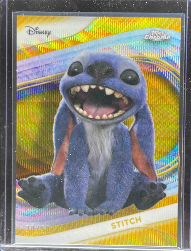 The Stitch 2025 Topps Chrome Disney #200 Gold Wave Refractor /50 card is 1 of 43 Stitch's card variations in the 2025 Topps Chrome Disney set being tracked by Sports Card Investor, including Base, Mini Diamonds Refractor, Prism Refractor, Refractor, and Yellow Mini Diamonds Refractor.