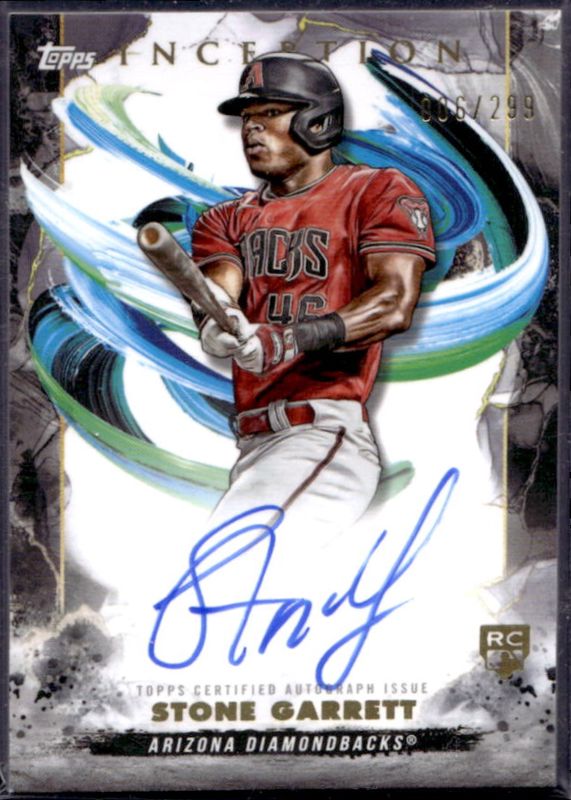 The Stone Garrett 2023 Topps Inception #BRES-SG Rookie & Emerging Stars Autographs /299 card is 1 of 16 Stone Garrett's card variations in the 2023 Topps Inception set being tracked by Sports Card Investor, including Base, Green, Purple /150, Magenta /99, and Red /75.