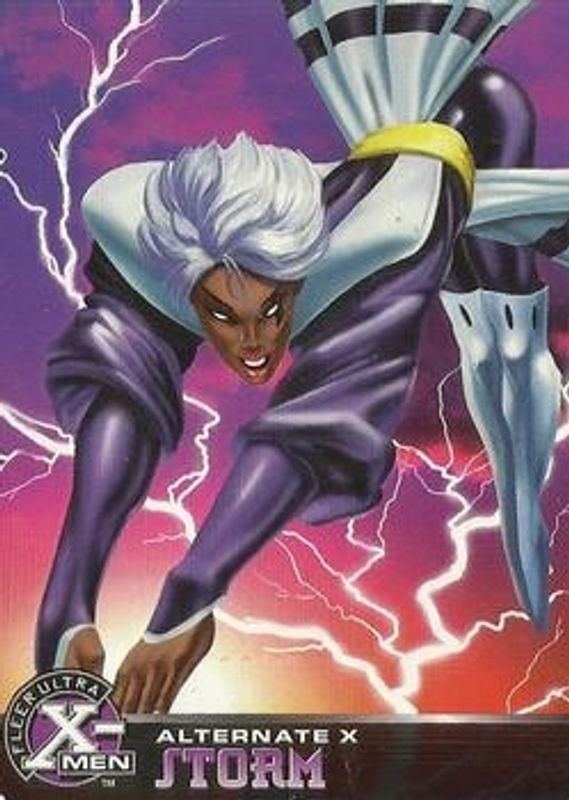 The Storm 1995 Fleer Ultra X-Men Chromium #18 Alternate X card is 1 of 6 Storm's card variations in the 1995 Fleer Ultra X-Men Chromium set being tracked by Sports Card Investor, including #12 Base, #98 Base, #12 Gold Signatures, #98 Gold Signatures, and #17 Alternate X.