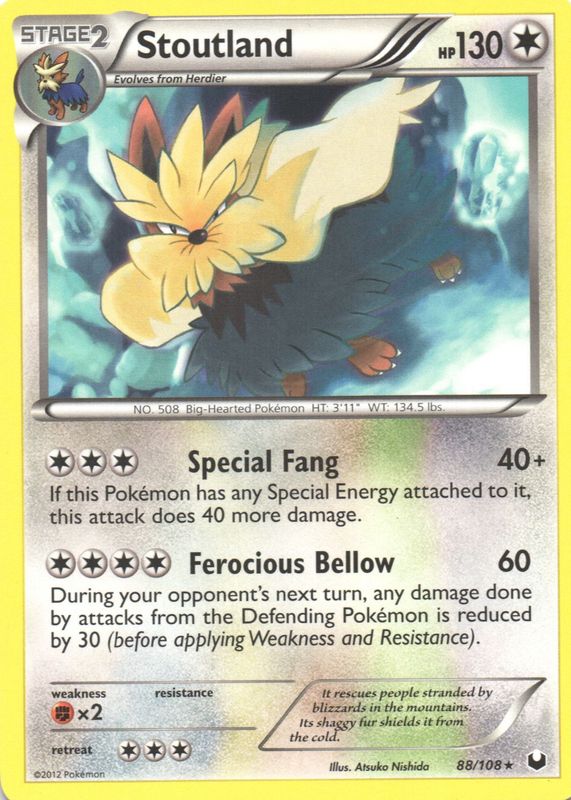 The Stoutland 2012 Black & White: Dark Explorers #088/108 Base card in Raw TCG (Near Mint) condition has moved down -$0.07 (-3.1%) in the last 30 days and was last sold for $2.19 .