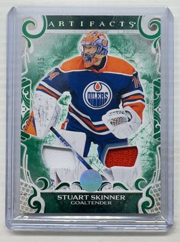 The Stuart Skinner 2024 Upper Deck Artifacts #105 Material - Emerald /35 card is 1 of 26 Stuart Skinner's card variations in the 2024 Upper Deck Artifacts set being tracked by Sports Card Investor, including Foilboard, Foilboard Gold, Neon Green, Plexi, and Silver /699.