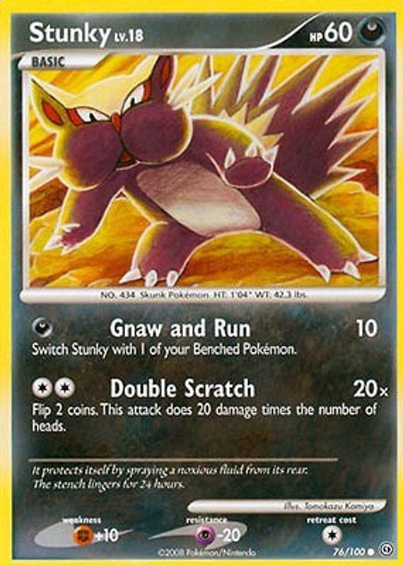 The Stunky 2008 Diamond & Pearl: Stormfront #076/100 Base card in Raw TCG (Lightly Played) condition has moved down -$1.13 (-43.8%) in the last 30 days and was last sold for $1.45 .
