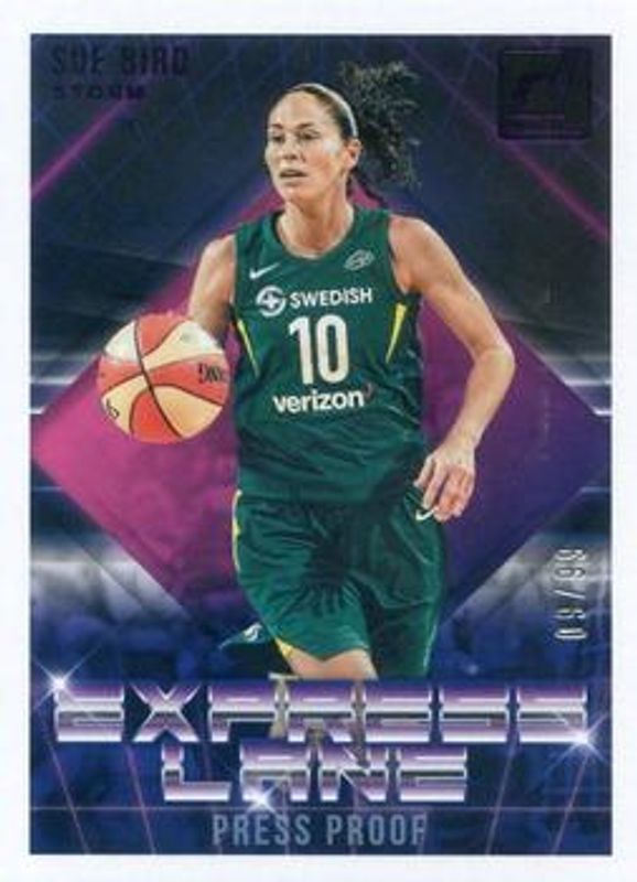 The Sue Bird 2019 Donruss WNBA #16 Express Lane - Purple Press Proof /99 card is 1 of 29 Sue Bird's card variations in the 2019 Donruss WNBA set being tracked by Sports Card Investor, including Base, Optic, Optic Holo, Silver Press Proof /199, and Purple Press Proof /99.